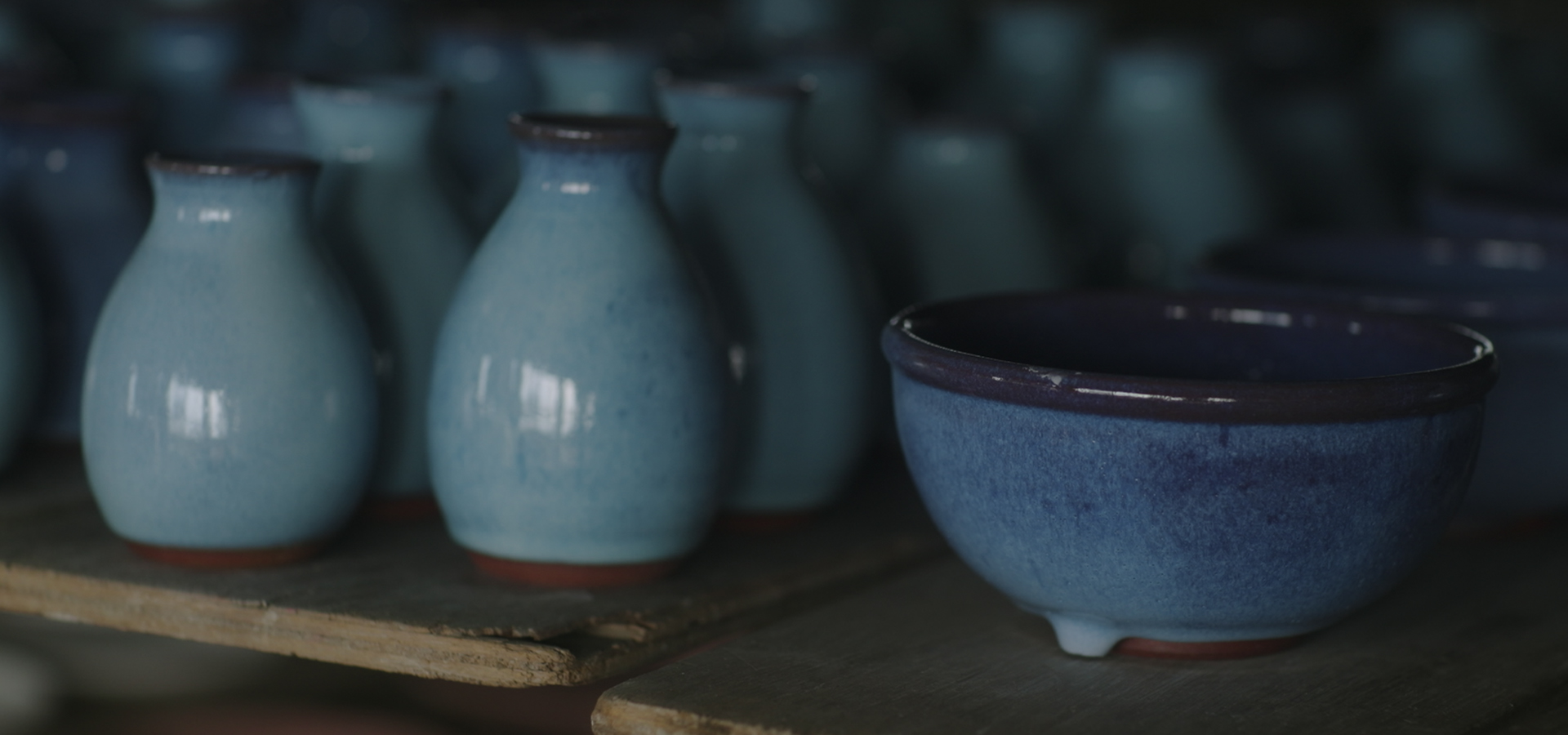 敷地内の豊富な陶土と、東山焼の特色でもある澄んだ青みの「なまこ釉」など、家伝の釉薬を用いて制作しています。使われる土は鉄分が高いのが特徴的で、高温で焼くことでよく焼締まる特性があるため、丈夫で割れにくく、高く評価されています。